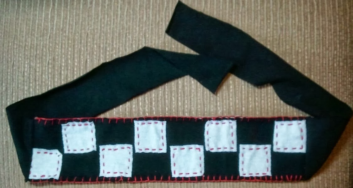 For my project today I took with me the little head band I had started so I could finish it. While learning and practicing the different stitches I decided to make something usable with the samples. Headbands give me the opportunity to do so and can be made with mostly scraps. This is what I finished today. The squares are cut from the same knit as the back of the band and sewn on with a straight stitch and the edges are done in a blanket stitch. You can't see it but the ties are sewn on with a back stitch which is a very strong stitch for that use. The thread is all 3 strands of embroidery floss. None of the stitches are new to me but hand sewing with nice even stitches take practice and I want to make a wearable garment when I get better at it.